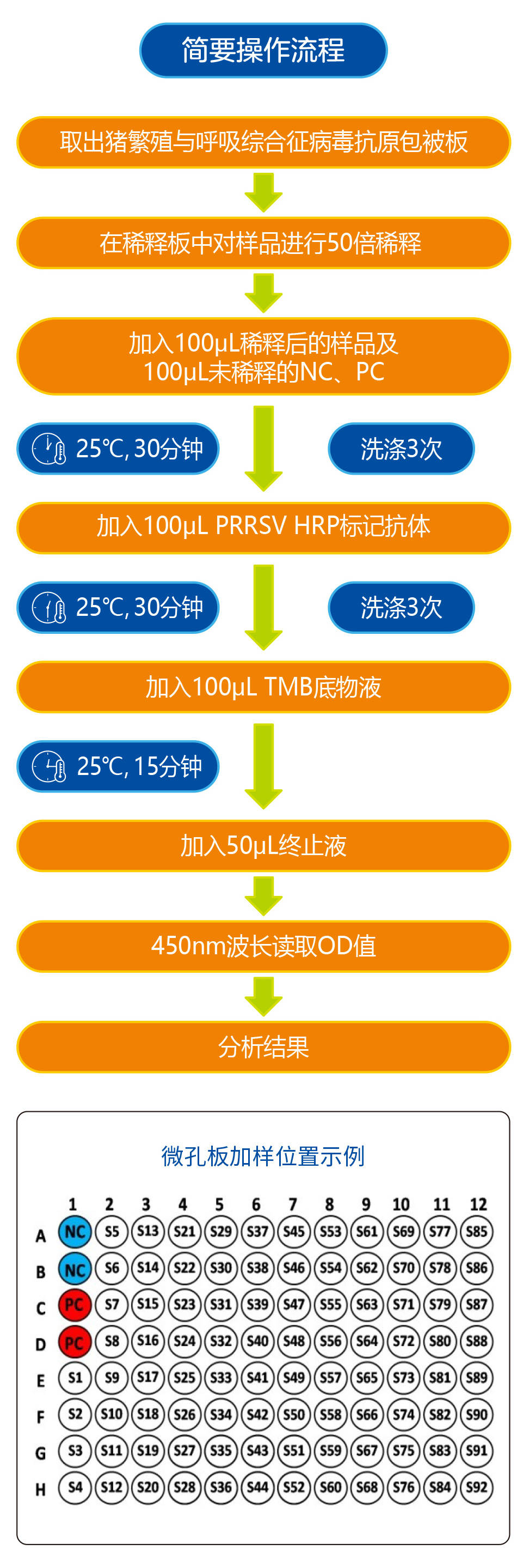 本试剂盒采用间接ELISA方法,包被板包被PRRSV重组N蛋白抗原,可通过HRP标记抗体来检测该病毒的特异性抗体。本试剂盒适用于检测PRRSVⅠ型(欧洲型)和PRRSVⅡ型(美洲型)病毒产生的抗体。