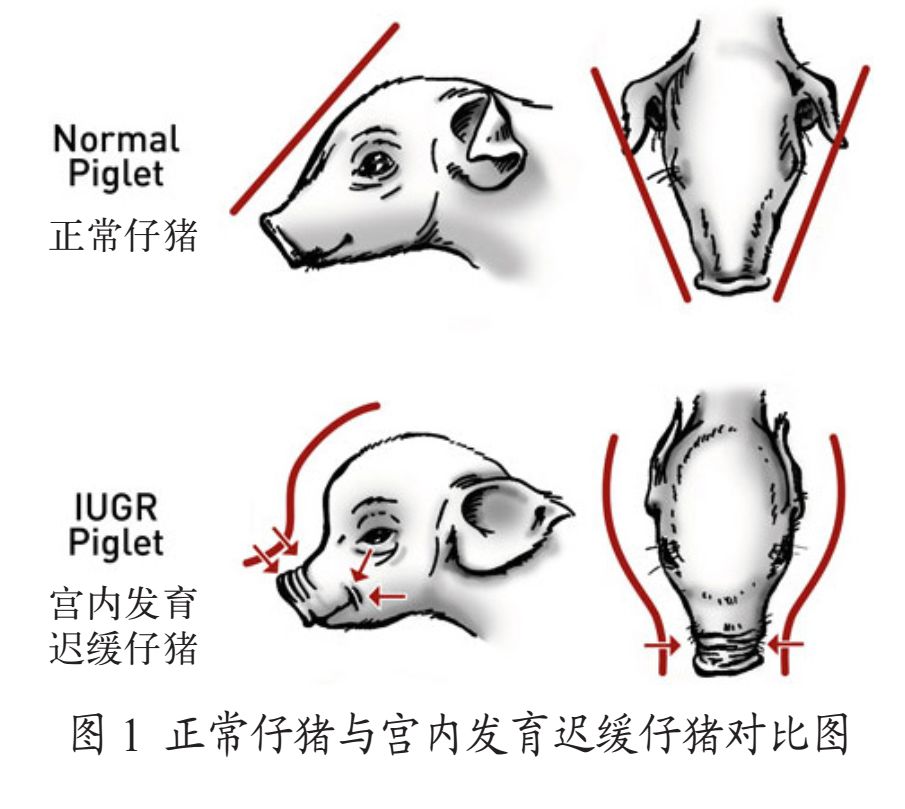 母猪每胎产仔数多,易导致胎盘功能不全,致使胎儿在母猪体内发育受阻,所以猪在所有家畜中是最容易出现宫内发育迟缓(intrauterine growth restriction,IUGR)病症的,这一疾病会影响仔猪肠道结构和功能的发育,改变其肠道菌群的定植,使其更易受到病原的感染。宫内发育迟缓的仔猪,较正常仔猪,其小肠较短,肠壁更薄,小肠绒毛更短,小肠上皮可吸收面积更小,肠上皮细胞和杯状细胞数量较少,并且因肠道屏障功能受损,致病菌更容易感染进入。(如图1,图2所示)