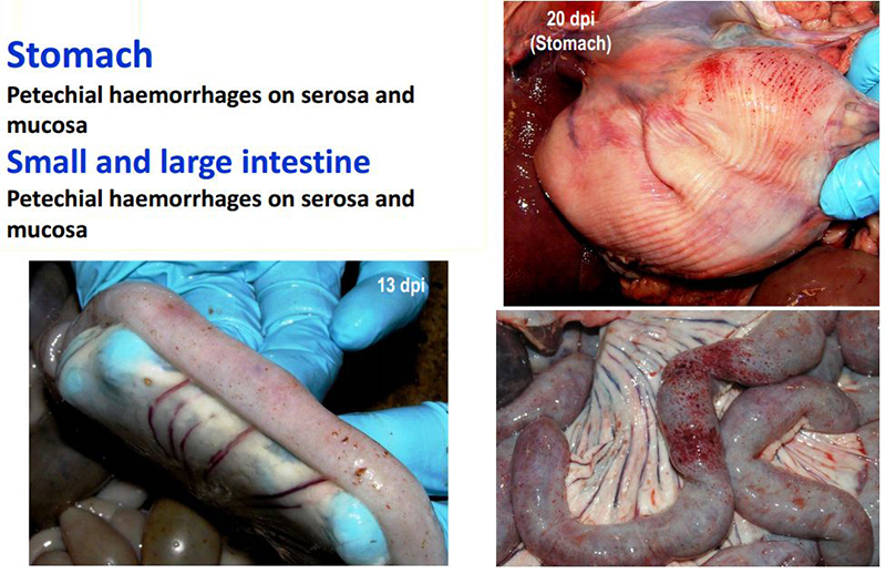 胃,浆膜和粘膜瘀点出血;小肠和大肠,浆膜和粘膜瘀点出血