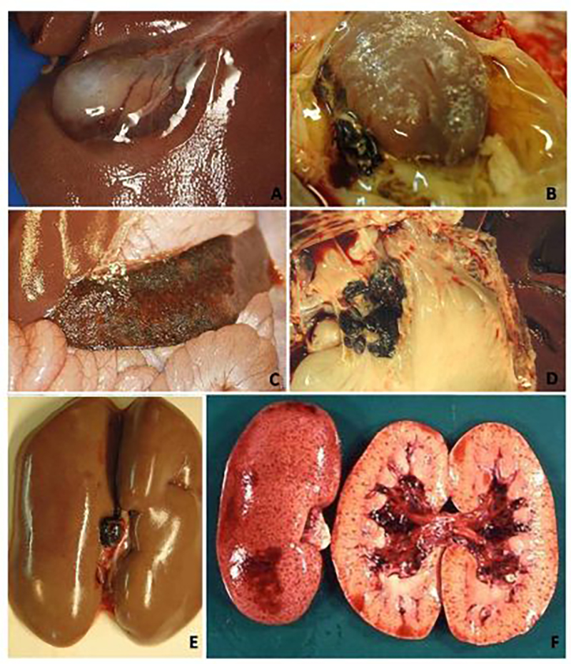 图42.亚急性猪瘟的病理变化:胆囊壁(A)和肾周围的显著的水肿(B);C:脾肿大;胃肝(D)和肾淋巴结(E)出血水肿;F:肾、皮质、髓质和肾盂有大量出血。(Sanchez-Vizcaıno et al 2015)
