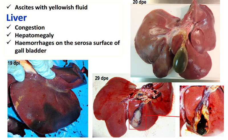 肝,黄色积液、堵塞、肝肿大、胆囊浆膜表面出血
