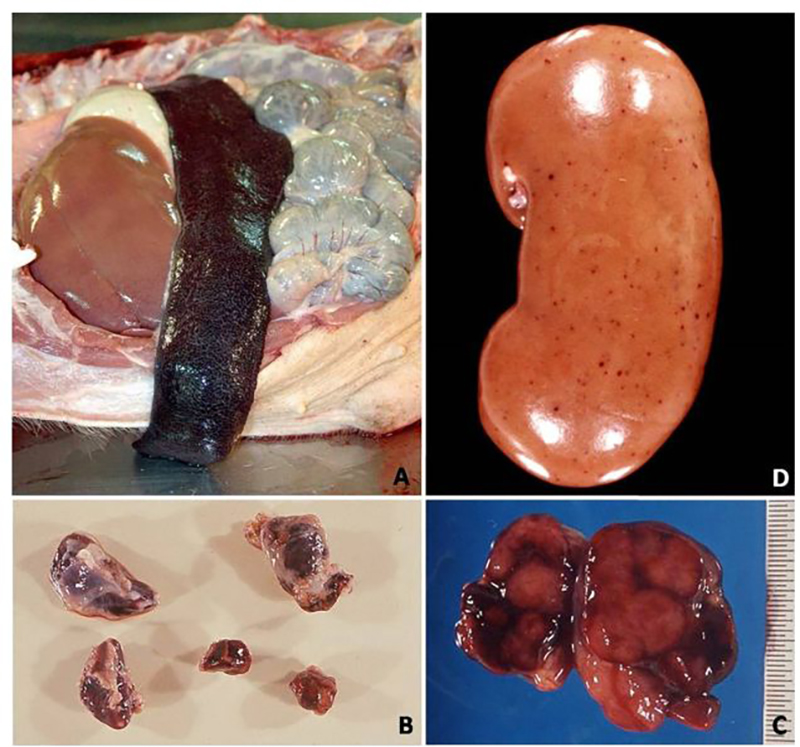 表现严重的肺水肿,同时为充血性脾肿大,可能达正常的六倍,边缘为原型,同时易碎,呈现为黑紫色(图41A);淋巴结,主要是胃肝和肾淋巴结上面有出血(图41C),呈现大理石花斑(图41C);肾脏皮质和肾盂中通常出现出血瘀点(图41D)。其他非典型病理变化还包括膀胱、心内膜、心外膜和胸膜有出血瘀点。