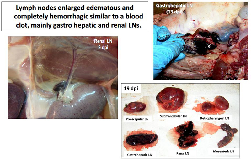 淋巴结,主要是胃肝和肾淋巴结,以及颌下腺、咽后、纵隔、肠系膜和腹股沟淋巴结出血、水肿和易碎,表现为深红色血肿