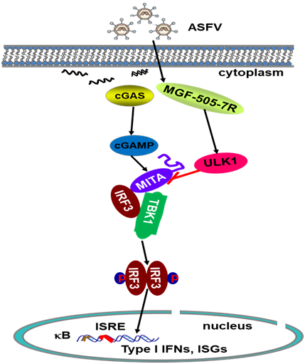 本研究阐明了非洲猪瘟病毒蛋白MGF505-7R抑制I型干扰素信号通路的分子机制,为非洲猪瘟疫苗设计提供新的靶标和理论依据。研究发现,MGF-505-7R能够抑制cGAS-STING诱导的信号通路,证实MGF-505-7R通过自噬蛋白ULK1降解STING,从而抑制I型干扰素产生。与野生毒株在细胞水平和猪体水平开展平行试验表明,MGF-505-7R基因缺失毒株能诱导产生较高水平的IFN-β,导致病毒较低水平复制,对猪致病性显著降低(10HAD50剂量攻毒,猪5/5不发病)。
